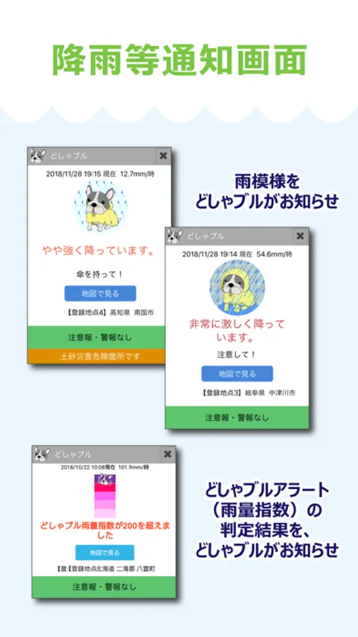 ●どしゃブル雨量指数をアイコンとメッセージで表示
