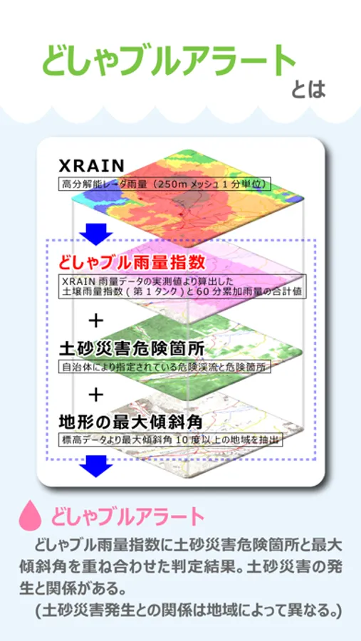 「どしゃブル雨量指数」とは、本アプリにおいて独自に開発した表層崩壊や土石流の発生と相関関係のある指数であり、過去の複数の土砂災害現象に対して、その発生との関連を確認できています。また、各都道府県が調査した土砂災害危険箇所、地形の最大傾斜角の情報と重ね合わせることで、土砂災害発生との相関が高くなることが確認出来ています。