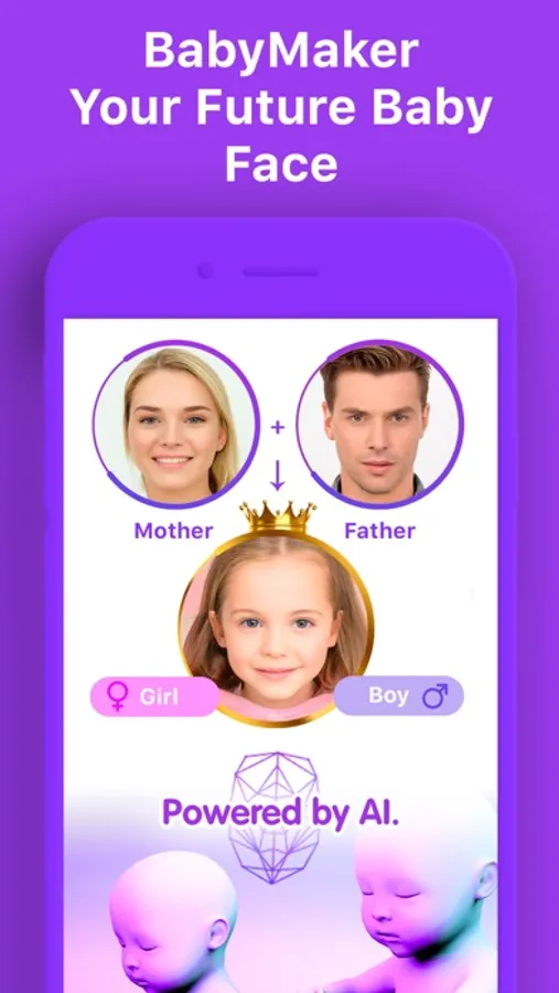 • Baby Maker. See what will your Future Daughter or Son looks like! Based on Exclusive AI Technology Baby Maker applies complex science to deliver hours of fun. We created a unique AI algorithm, based on the study of thousands of faces and on complex mathematical calculations and biometric analysis. Future Baby Maker simulates a photo of your possible common Baby with whoever you want in seconds. Let's check out! Hope you enjoy it!
