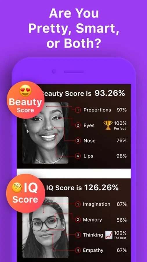 • Beauty analysis (Beauty Score) & Face Symmetry Tester. The app calculates the geometric proportions of facial features, such as eyes, nose, lips, etc., as well as the distance between them. When the face analysis is finished, you can see what features of your face determine your beauty. Find out how beautiful you are!