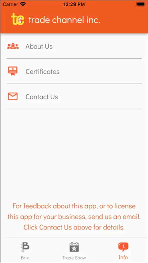 The App services business and marketing needs for Trade Channel Inc., including a list of trade shows with the ability to schedule meetings, a contact page, a products page and a certifications page.