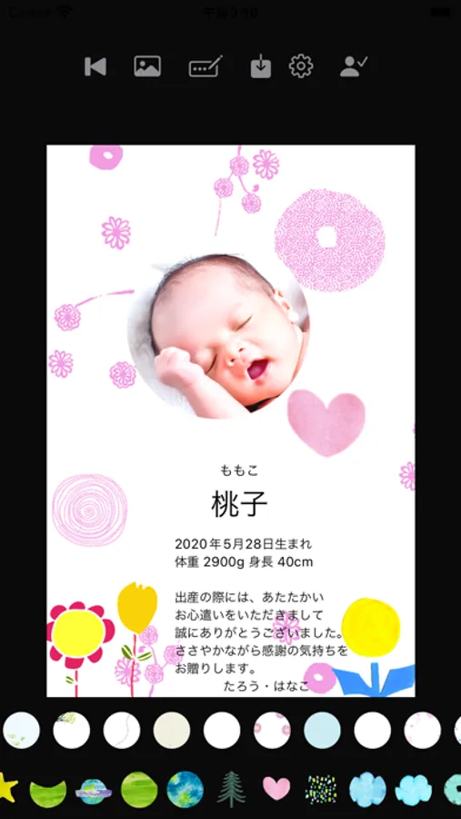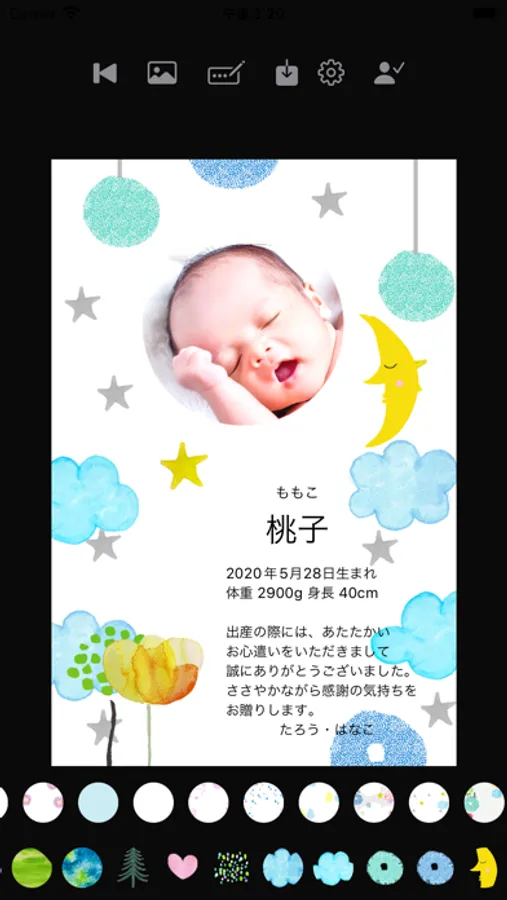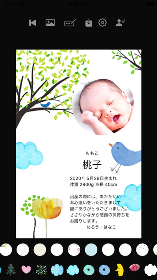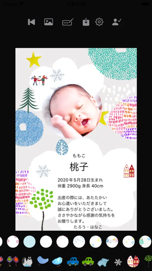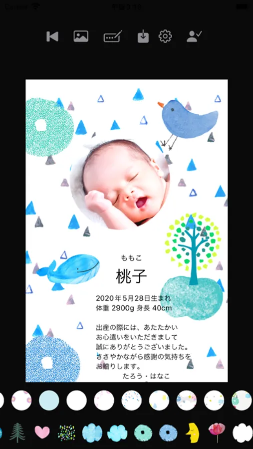 育児や仕事で大変な時でもストレスなく写真つきの内祝いカード、命名カードやお礼状が作れます。