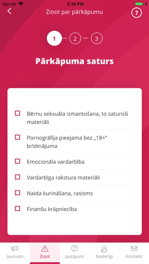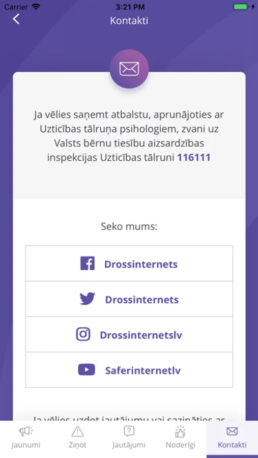 Izmantojot lietotni, iespējams sazināties ar mums un saņemt atbalstu un ieteikumus problēmsituāciju gadījumos. Piemēram, lietotnē var ziņot par gadījumiem, kad esat saskāries ar nelegālu vai bērniem nepiemērotu saturu, arī emocionālas pazemošanas, šantāžas, draudu saņemšanas u.c. gadījumos.