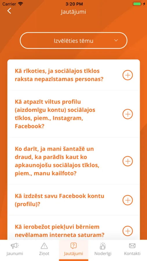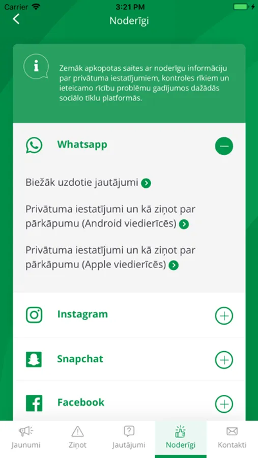 Lietotnē pieejama arī noderīga informācija par privātuma iestatījumiem, kontroles rīkiem un ieteicamo rīcību problēmu gadījumos dažādās sociālo tīklu platformās, tāpat iespējams iepazīties ar biežāk uzdotajiem jautājumiem un saņemt atbildes uz tiem.