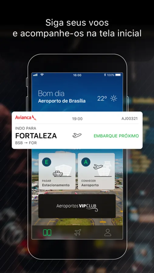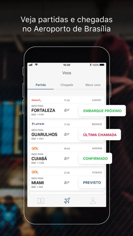 Com o app Aeroporto de Brasília, você pode seguir e acompanhar as chegadas e partidas de voos domésticos e internacionais. É só pesquisar o número do voo e pronto! Todas as informações serão atualizadas em tempo real.