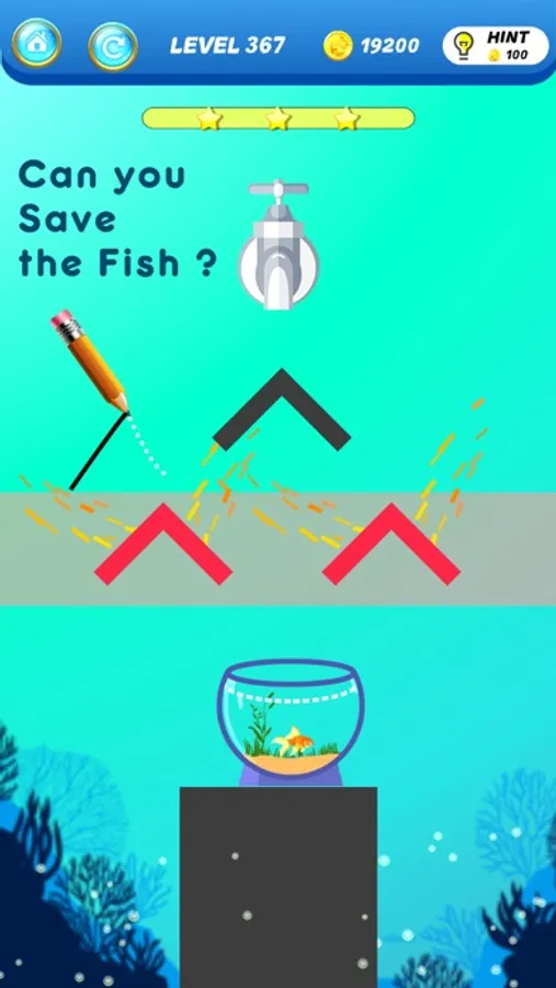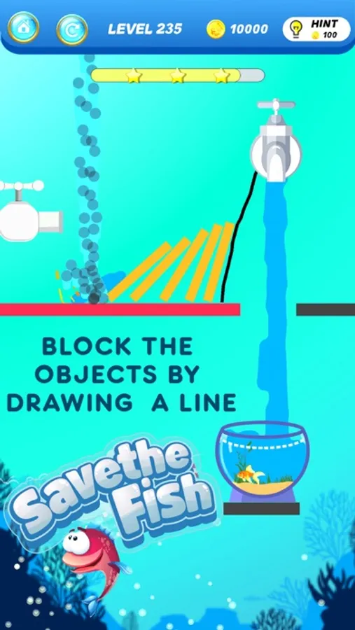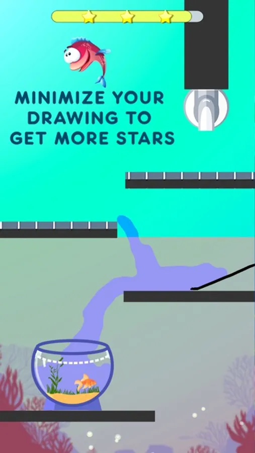 The aquarium is empty, Your job is to draw a line to make the aquarium filled up with water and save the fish! There are Many ways to complete levels, Try to find the best way to complete each level and get 3 stars.You have to think out of the box and use your creative solution to pass level.levels may look easy but it's more challenging, let's see are you able to get 3 stars or not!