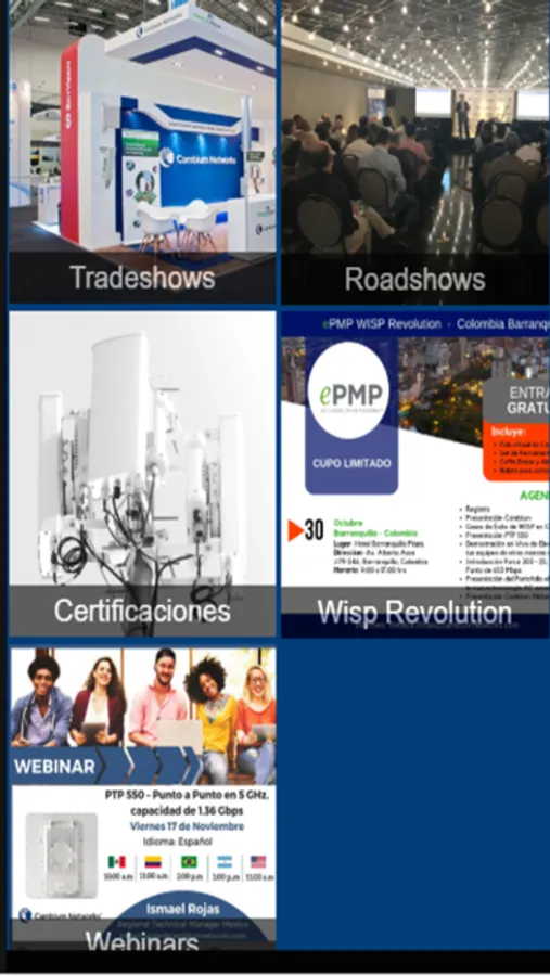 Aplicación Móvil dirigida a los usuarios de Cambium Networks Caribe y Latinoamérica (CALA) con el objetivo de mostrar el portafolio de sus productos y características más relevantes asi como los principales eventos en los que estará participando la marca. Adicionalmente esta aplicación permite establecer contacto entre los usuarios y el equipo de Cambium Networks CALA para aclarar dudas y comentarios.