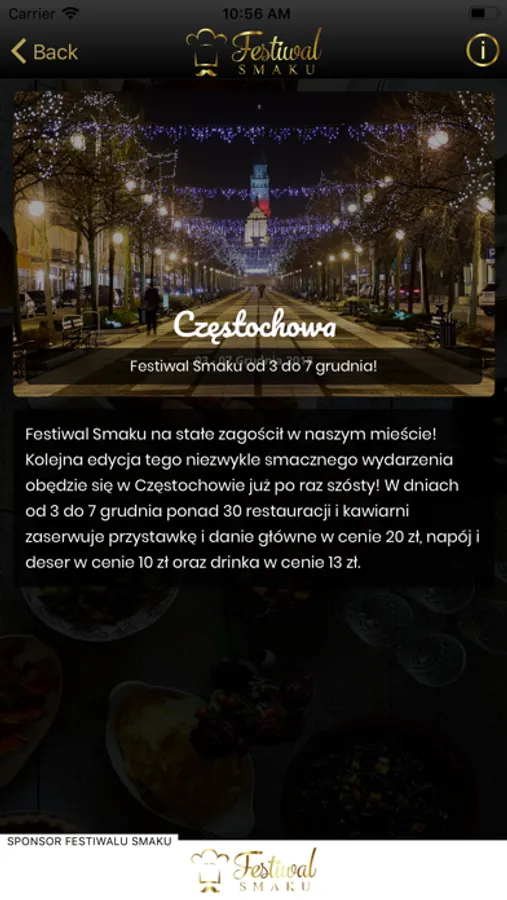 The "Festiwal Smaku" is the largest culinary event in Poland. Download the application and plan a culinary journey around the festival premises of your city. Check out the list of the tastiest restaurants and the sweetest cafes. Menu with photos and an intuitive map available from stock.