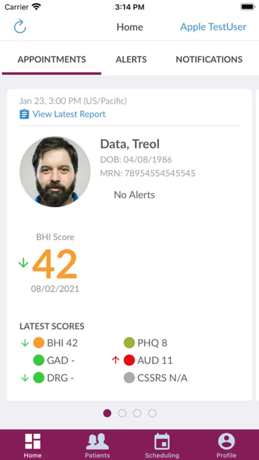 Home - where you can view your next 5 upcoming appointments, critical alerts and notifications of new appointments scheduled.