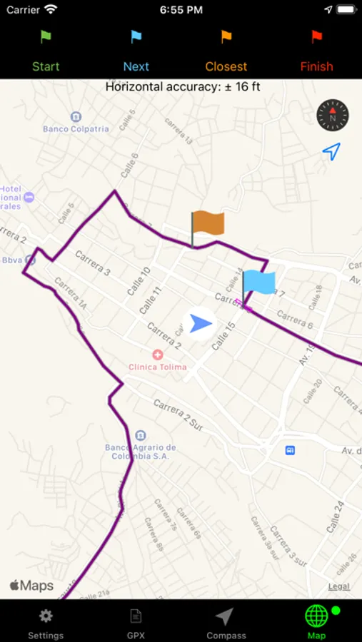 Display user location, route, start, finish, and next point.