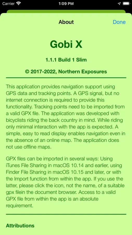 The application was developed with bicyclists riding the back country in mind. While riding only minimal interaction with the app is expected. A simple, easy to read display enables navigation even in the absence of an online map. The application does not use offline maps.