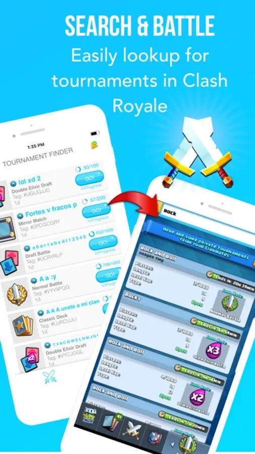 A FAST and EASY way to find FREE TOURNAMENTS in *Clash Royale*. Clash Royale Tournament Finder helps you have more fun and play real tournaments without spending all your gems! We will also notify you when a big tournament is open and free for you to play, and who knows? Perhaps even win, acquiring more cards to increase your deck level!