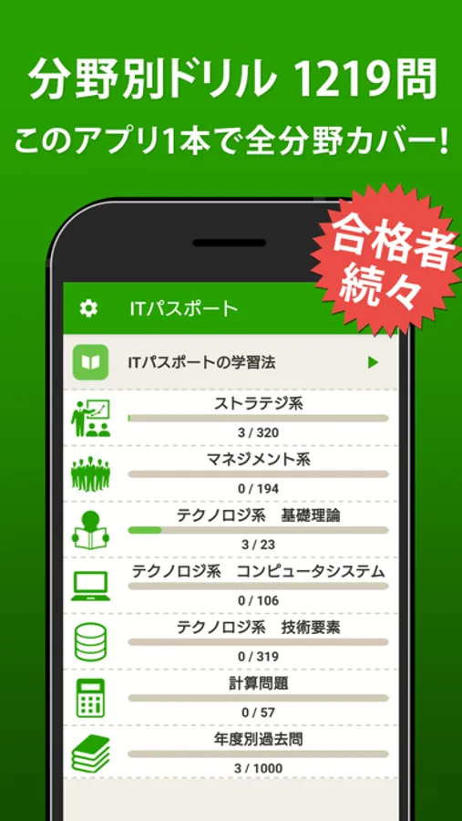 ITパスポート、究極の無料アプリ!分野別ドリルと年度別過去問、全2419問題を収録。