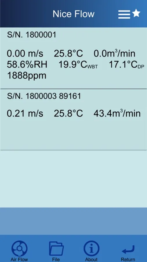 The Nice Flow App can display the measuring value from compatible wireless anemometer. The measuring data can be imprinted on the photo took at site, or logged with average calculation by smart device, logged data can be viewed on mobile or send out in CSV format via mail.