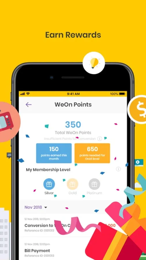 Get rewarded every time you pay your bills. For every RM1 paid, you will get 1 WeOn Point, which you can convert to WeOn Credit and use for your next bill payment. Pay more bills to save more money on your bills.