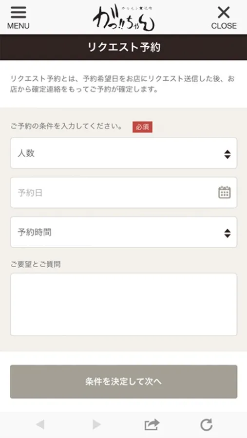 希望の人数・日時を指定して送信するだけで予約を依頼できます。