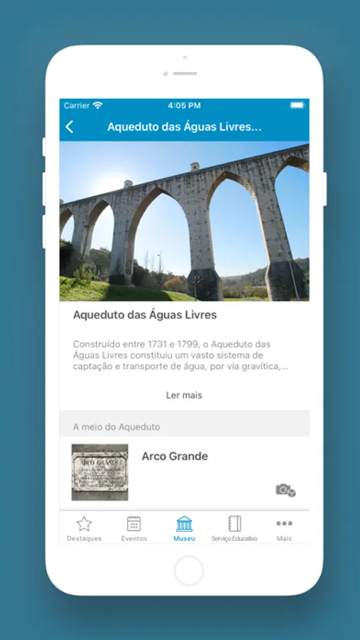 O Museu da Água é um museu disperso pela cidade de Lisboa, constituído pelo Aqueduto das Águas Livres, Reservatório da Mãe d’Água das Amoreiras, Reservatório da Patriarcal e pela Estação Elevatória a Vapor dos Barbadinhos. Para ficar a conhecer todo o seu património através da visita a estes monumentos dos séculos XVIII e XIX, convidamo-lo a descarregar esta APP, na qual poderá aceder a todas as informações de como chegar, agenda, notícias, textos informativos, imagens e experiências de realidade aumentada com histórias inéditas sobre alguns personagens da nossa história.