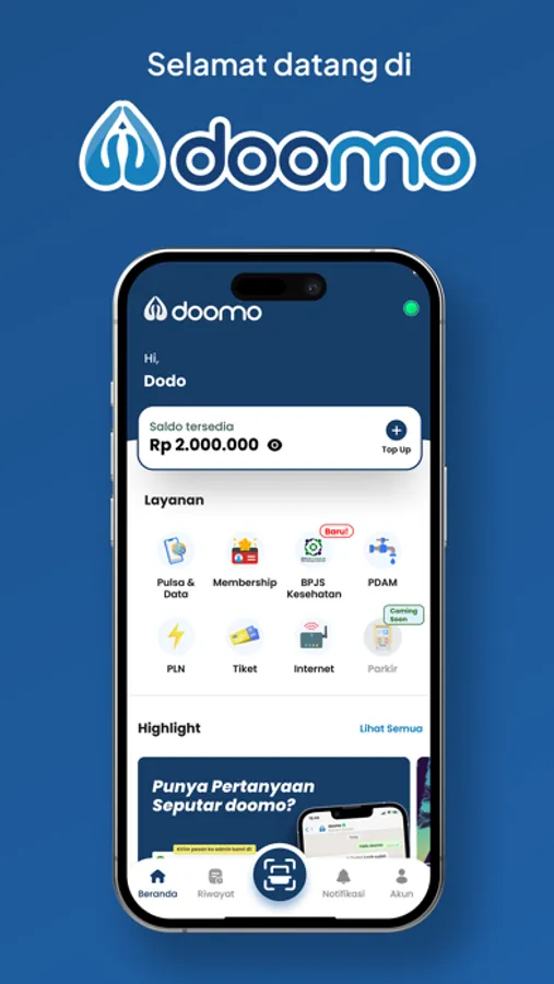doomo adalah sebuah aplikasi Financial Technology (fintech) yang hadir sebagai solusi transaksi secara digital (non-tunai) yang memudahkan penggunanya untuk bertransaksi kapanpun, dan dimanapun. Doomo memberikan kemudahan pembayaran menggunakan Scan QR melalui Smartphone anda, kini kemudahan bertransaksi ada dalam satu genggaman.