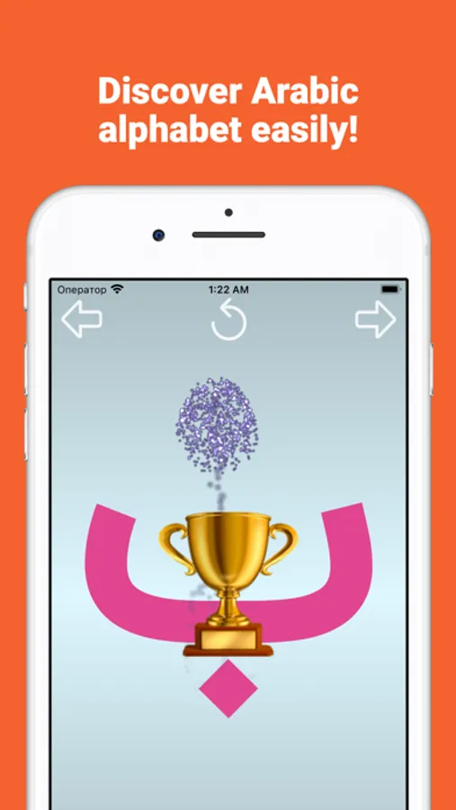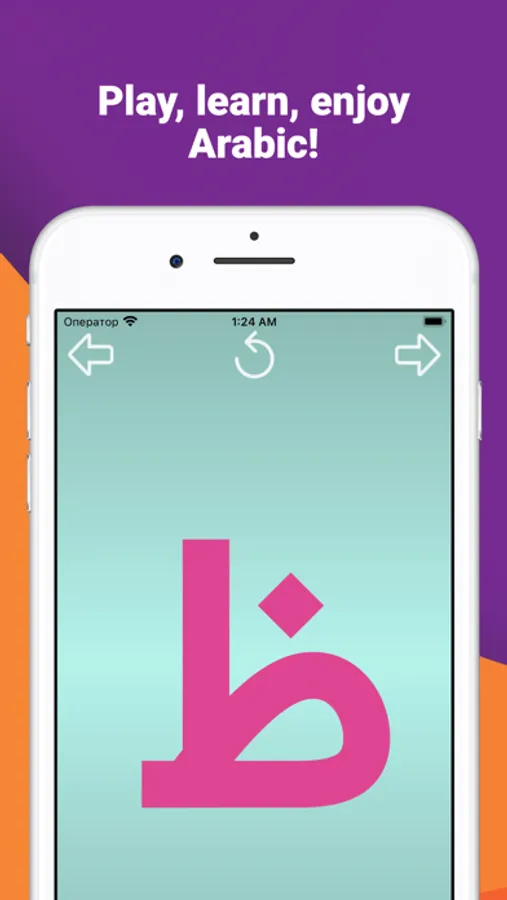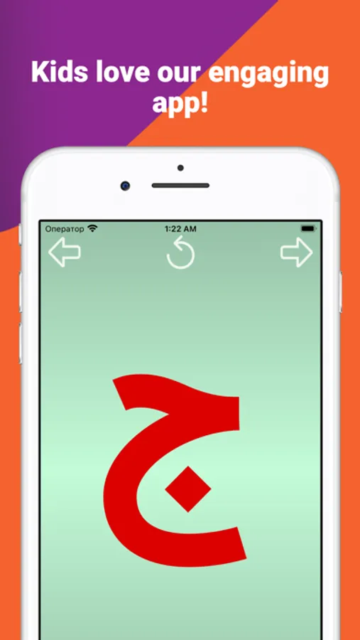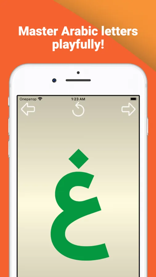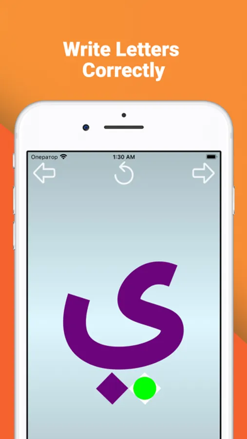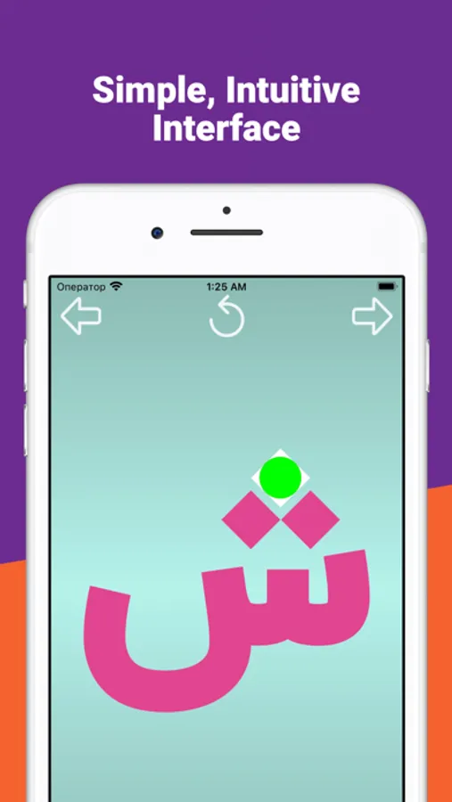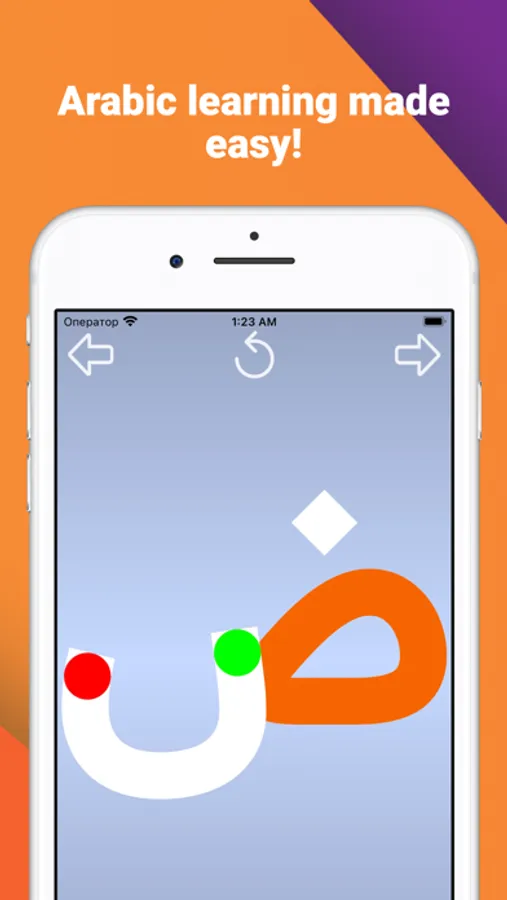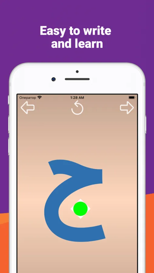 The "Write and learn Arabic letters" application is designed specifically for children to memorize letters. To facilitate the writing of letters complex letters are divided into separate elements. For correct writing, each element of the letter is equipped with an arrow showing the direction of movement of the finger and two circles: green to start the movement, red for the end.