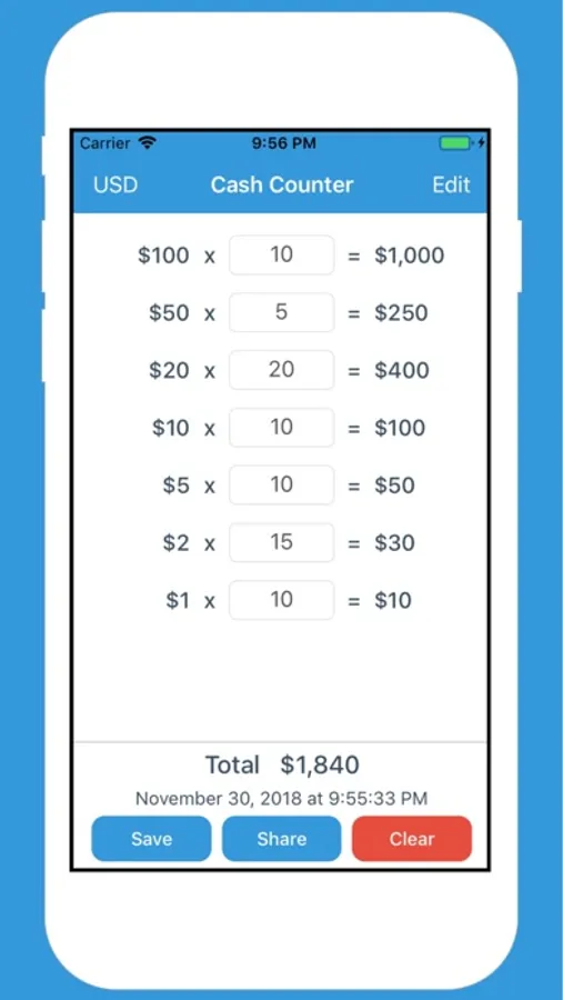 Cash Counter makes a way for money counting. It will help you to sum total values of banknotes and coins effectively and also keep your counting for future usage. It's time to put away the old fashioned calculator and be more productive with Money Counter.