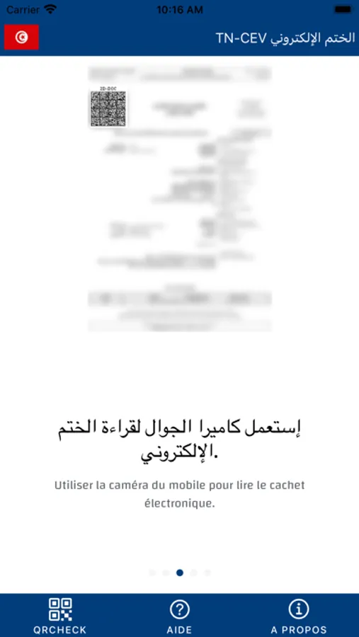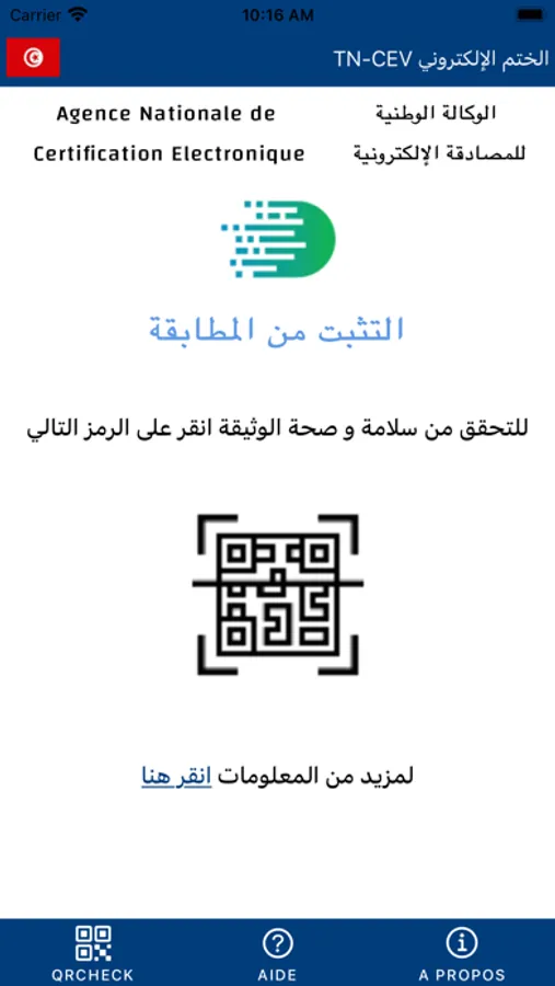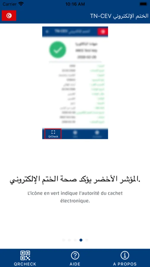 La vérification du Cachet Electronique Visible TN CEV 2D-Doc se fait moyennant l'application QR-Check disponible gratuitement. Cette application permet de lire le Cachet Electronique Visible apposé sur un document moyennant la caméra de l'appareil mobile. Les informations incluses dans le cachet sont alors extraites et doivent correspondre aux informations inscrites sur le document. L'application QR-Check vérifie également la validité de la signature électronique de l'émetteur du document pour s'assurer de l'intégrité des données incluses dans le Cachet Electronique Visible.