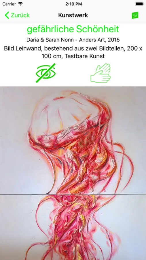 Die App bietet Informationen zu den ausgestellten Kunstwerken für blinde und Sehbehinderte Besucher, in leichter Sprache und teilweise in Gebärdensprache. Wenn Sie sich in der Ausstellung befinden, werden Ihnen die sich in Ihrer Nähe befindlichen Kunstwerke angezeigt und Sie können sich deren Informationen ansehen.