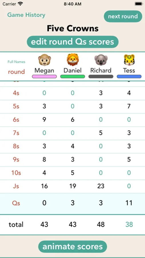 • Check out the "Animate Scores" screen to watch your animals compete for the win!