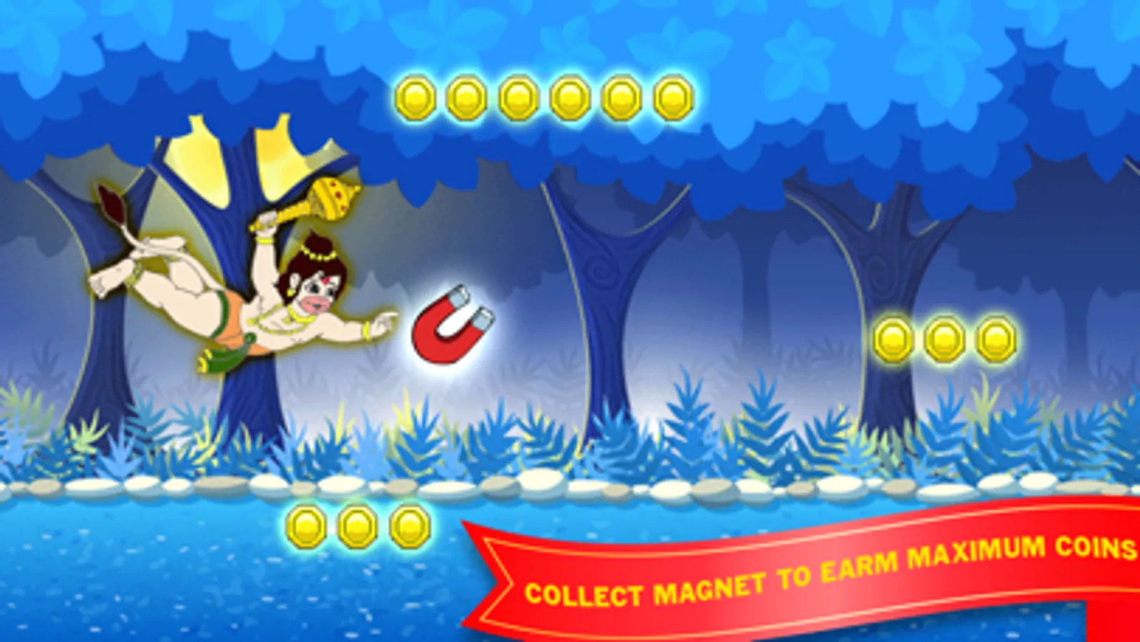 In this game one has to help Hanumanji to fly with right altitude to pass the hurdles. Each passing hurdle would fetch player 2000 points and if player finishes listening the Entire Hanuman Chalisa without falling the player wins the game. For that he need to score approximately 100000!