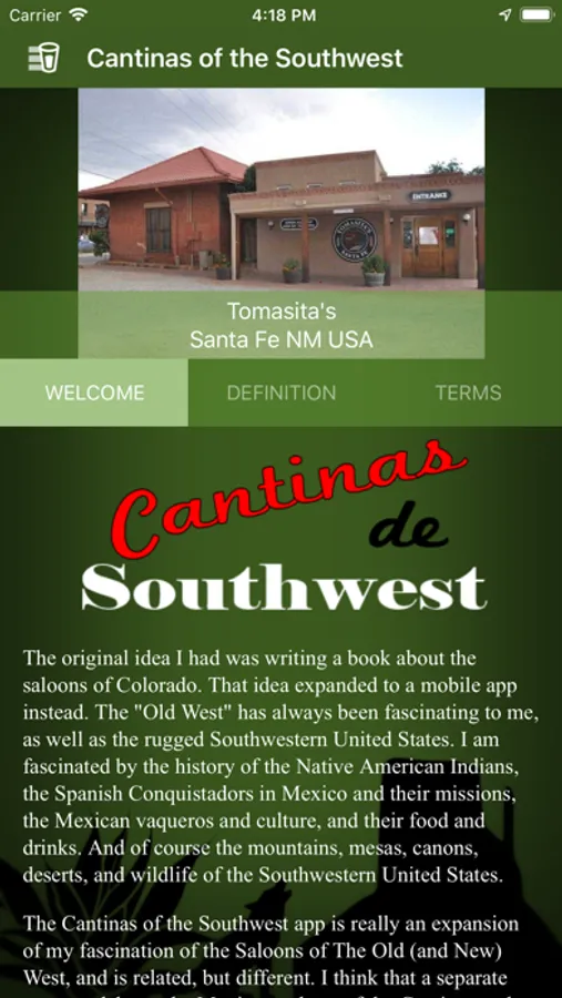 The Cantinas of the Southwest app is really an expansion of my fascination of the Saloons of The Old (and New) West, and is related, but different. I think that a separate app to celebrate the Mexican culture of the Cantinas makes sense to do. The app shows the motif, and the language, of the cantinas, which is different than the "Western Style Bar" we know as a saloon.