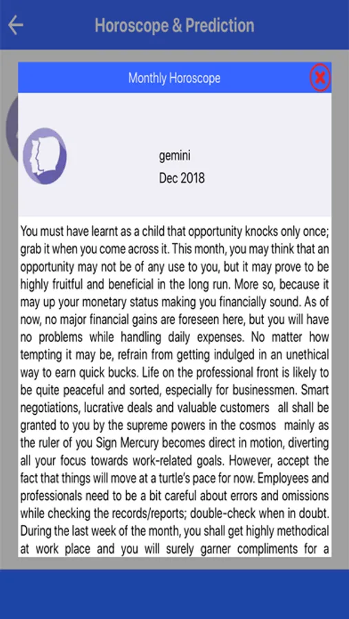Horoscope and Prediction app gives your free daily, weekly, monthly and yearly horoscope according to your zodiac sign. Also in Prediction section you get the answers of some selected questions which comes in our mind for our future or daily life.