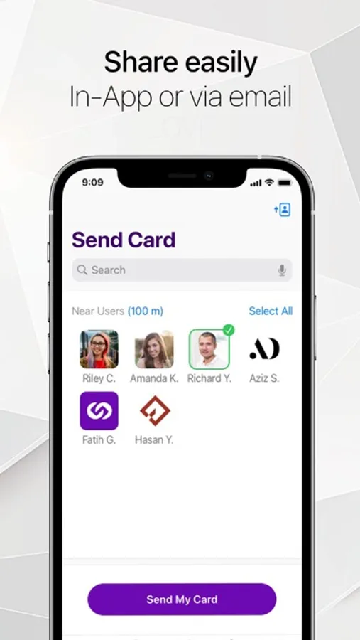 You may send out your card individually or as a whole to the Cloud Card users within the range of 100 meters through the app. If the person you wish to send is not nearby or not a Cloud Card user you may send your card via e-mail with the descriptions by clicking the send icon placed on the upper left corner.