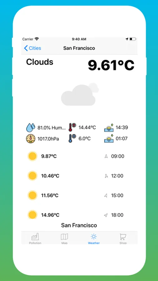 - Displays basic weather metrics for a selected location such as: temperature, humidity, atmospheric pressure, and wind vector (wind speed, wind direction).