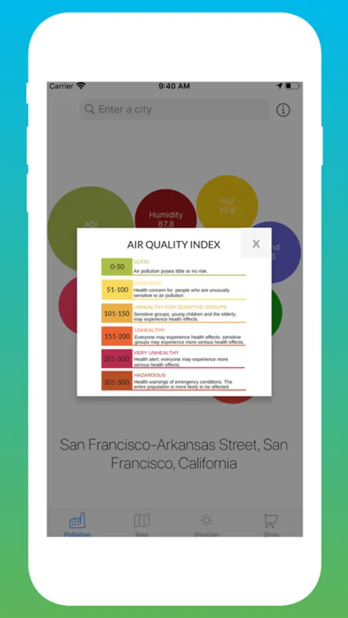 - Automatically fetch and display local Air Quality and Air Pollution data as a pollution meter from the nearest reporting station using your phone's GPS location.