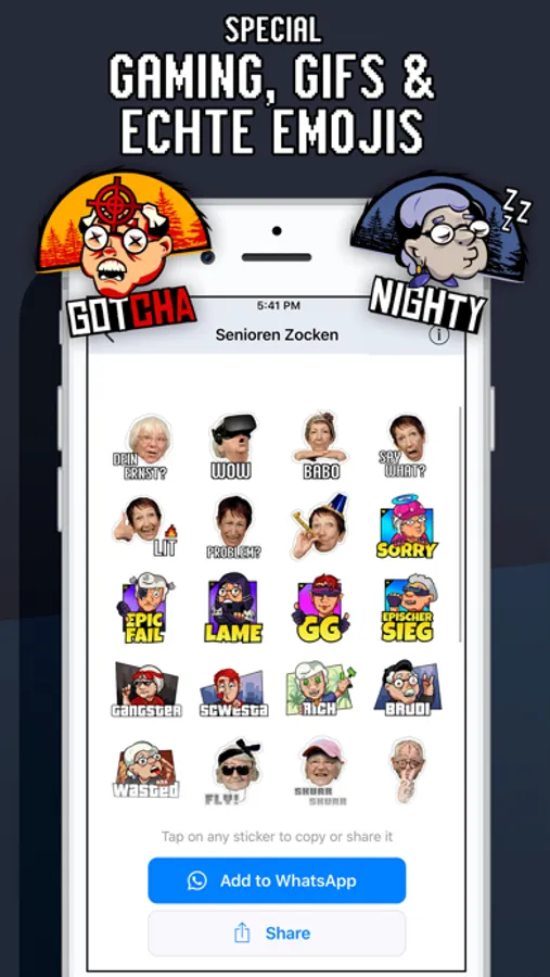 Wir sind die Senioren, die keine Angst haben vor neuer Technik! Wir spielen mit euch und für euch die neusten und besten Computerspiele. Haben wir darin Erfahrung? Nein! Aber wir bemühen uns und lassen nicht locker! Und jetzt haben wir sogar unsere eigene Emoji App und ihr könnt uns direkt auf dein Handy holen und ganz einfach direkt über Whatsapp und iMessage exklusive Sticker, Emojis und Gifs an alle deine Freunde versenden.