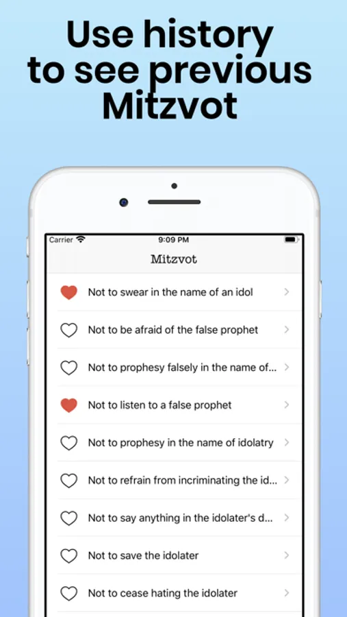 • Receive all mitzvot at once in your History tab and browse your favourite mitzvot at any time.