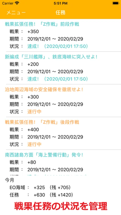 ・戦果任務のクリア状況や獲得できる戦果が分かります。