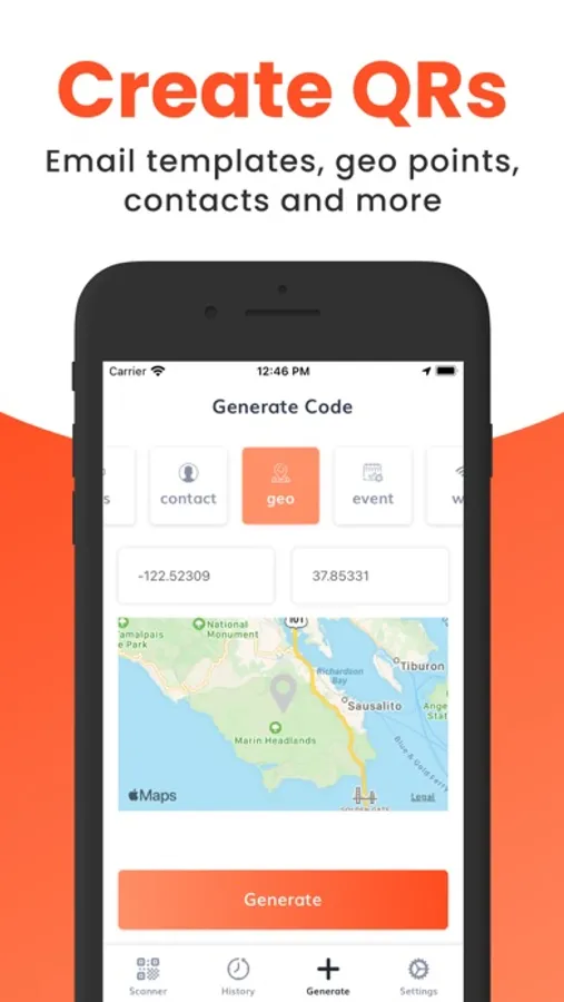 - Generate any type of code: text, URL, email, phone number, SMS, contact, event and more.