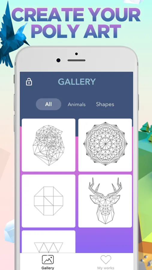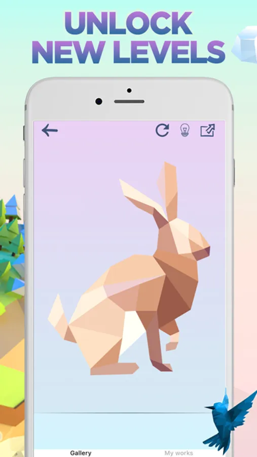 Brand new Low Poly for you! Cool art-puzzle, with a lot of new polygons. Now you can evolve 2D-polygon into colorful 3D-model!