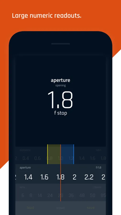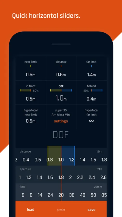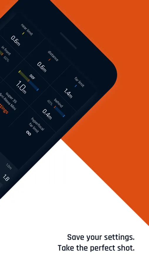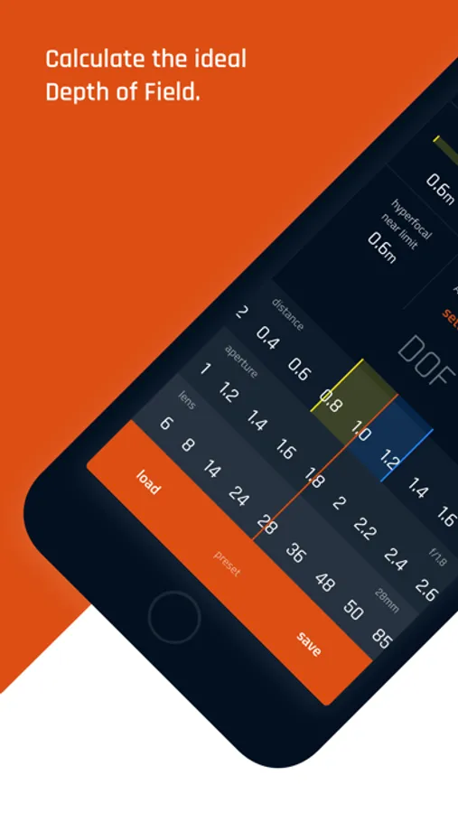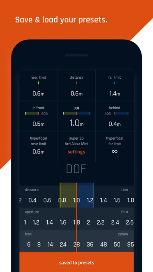 No more messing about with a cardboard Guild Kelly calculator. Calculate the ideal Depth of field for your cinematic production with three simple sliders for distance, aperture, and lens. Got your perfect settings? Great! Now save it for future projects, ready to be loaded any time you need it.