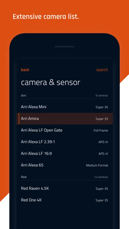Cameras are plentiful. DOF Cinema features a vast collection of camera models from Arri, Blackmagic, Red, Panasonic, and Sony. Including film formats like Super 16, Super 35, Full Frame, and medium format is also available.