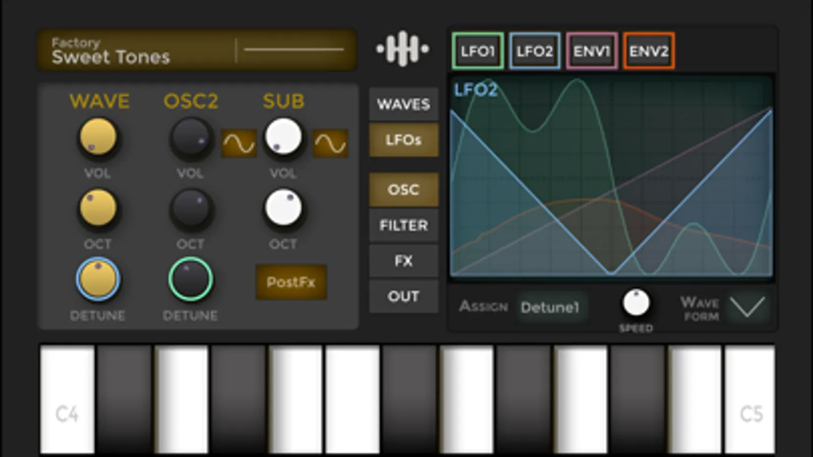 2 Lfo and 2 Envelopes with indipendent time can be assigned to virtually any of the synth parameters. They can also be graphically designed with the touch of your finger or you can choose among the builtin envelopes.