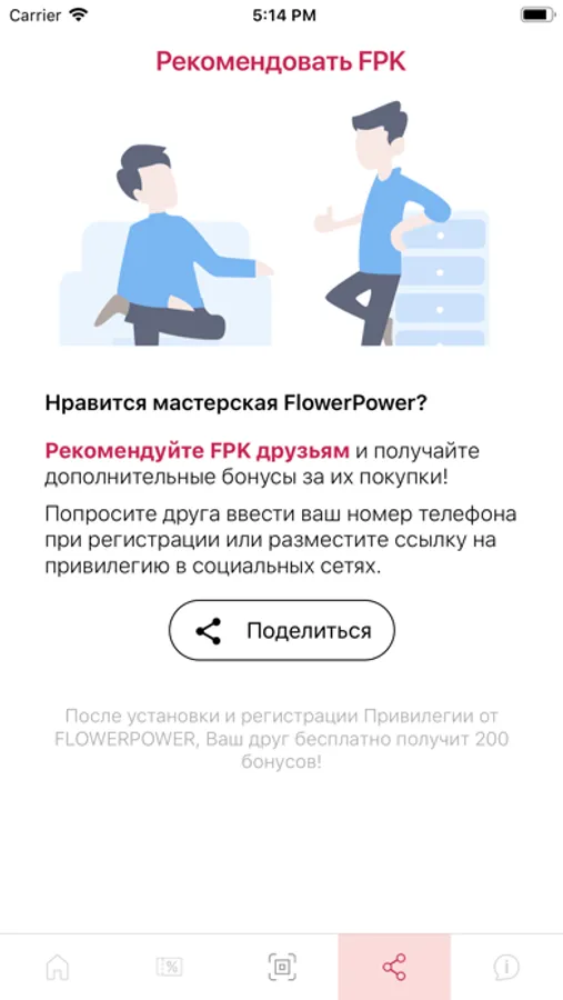 2. Вы скачали наше приложение и зарегистрировались в нем. И Вы, являясь участником программы Привилегия от FlowerPower, рекомендуете его своим друзьям и знакомым. За покупки, которые они совершают в FlowerPowerKzn или Airballs Вы получаете баллы и также можете использовать их в виде частичной оплаты за любой товар, представленный в компании.