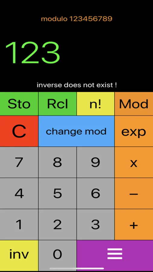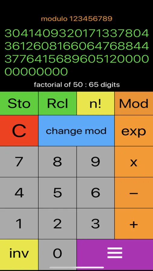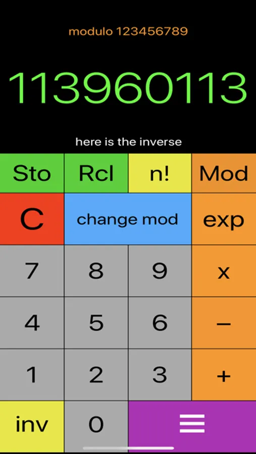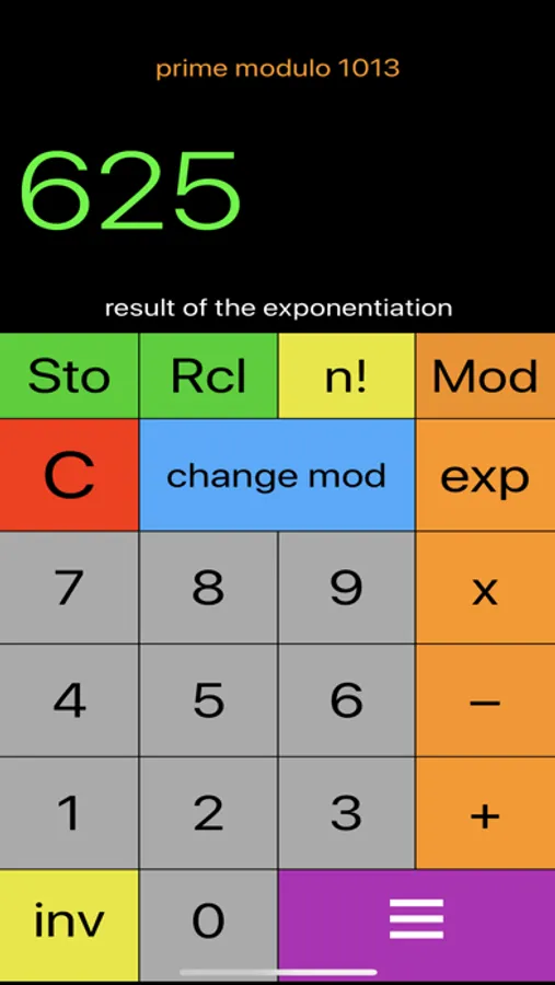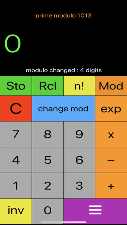 The "change mod" (change modulo) function indicates when the modulo is prime. There is a limit to 10^10 for modulo in this FREE version (no limit with ProX version).