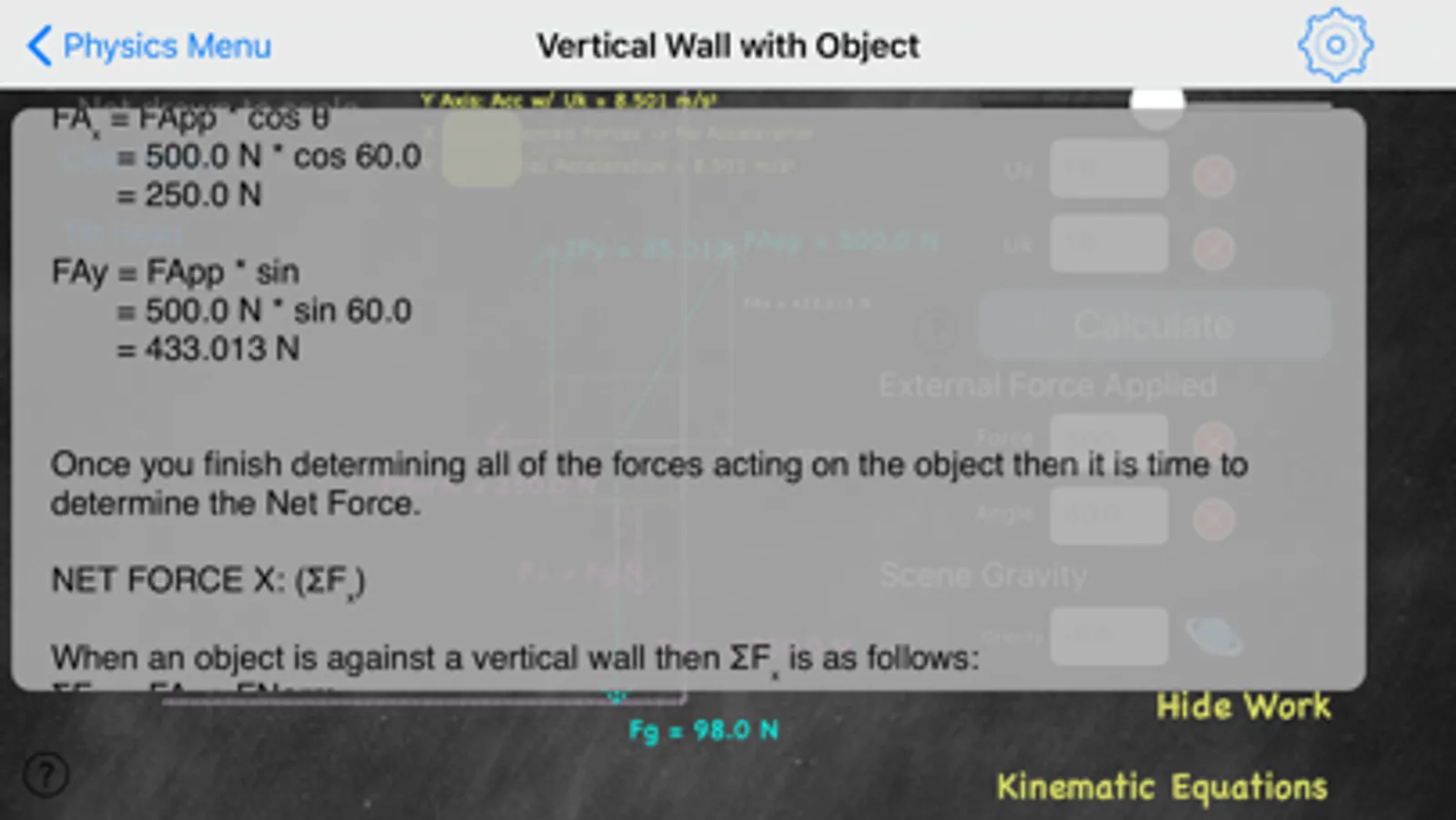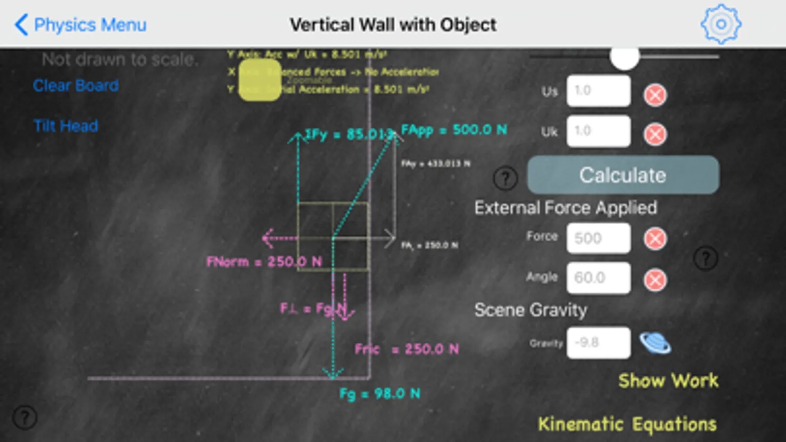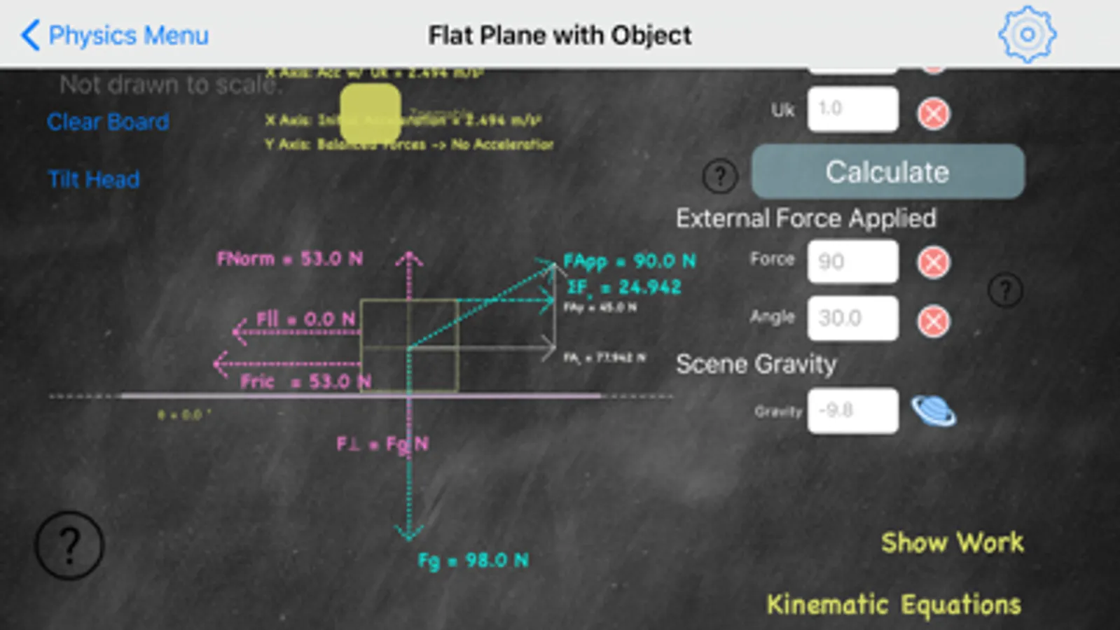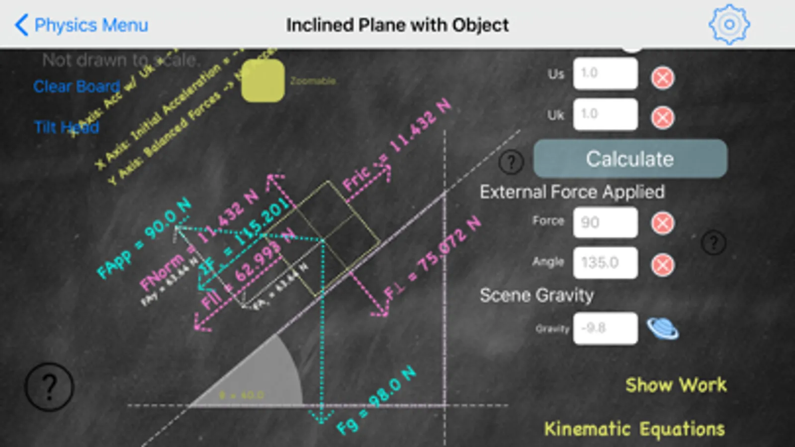 Additionally, if your teacher throws you a curve ball, we also provide you the ability to model a fixed scenario of your choosing in the iPad version. While iterating the scenario you can change specific variables-including incline angle, force applied, force applied angle, mass, and coefficient of static friction. Modeling functions generate step by step reports for each answer so you can check your work.
