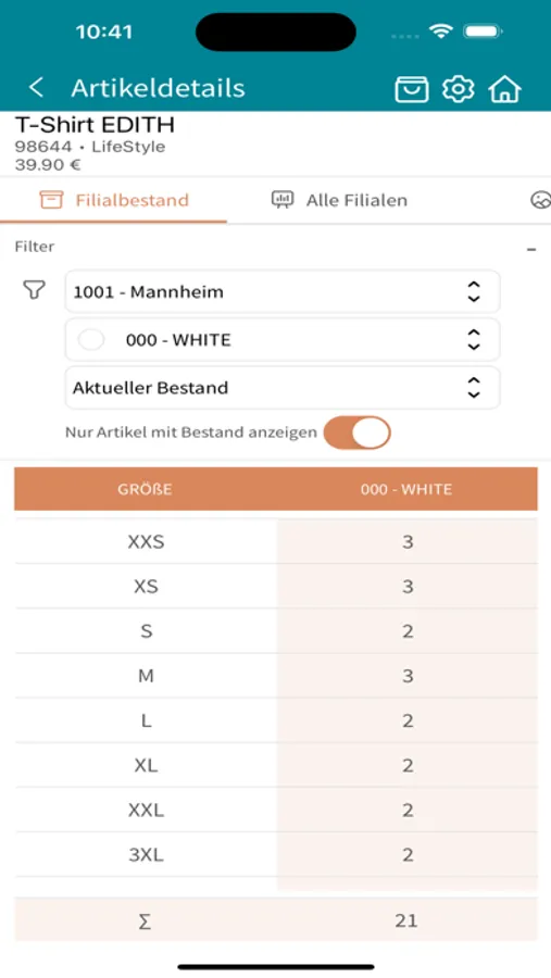 Filterkonzept: Mit dem neuen Filterkonzept können Bestandsdaten übersichtlich selektiert und verfeinert werden. Zur Filterung stehen z.B. die Kriterien „Datum“, „Lieferant“, „Farbe“ oder „Größe“ zur Verfügung.