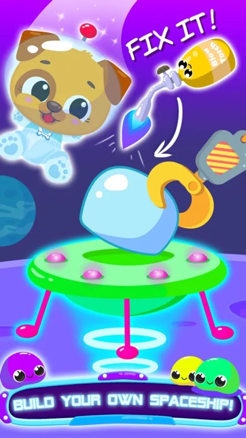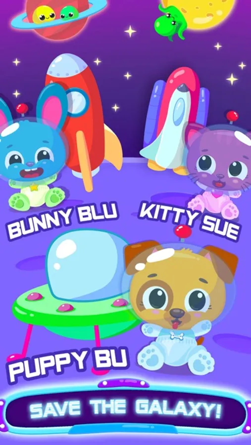 Explore Cute & Tiny Galaxy with the sweetest baby pet astronauts - kitty Sue, puppy Bu and bunny Blu - in this super fun space travelling game for boys and girls, kids and toddlers! Build a cute spaceship, put on your astronaut outfit for kids and go on fun space adventures! Travel the universe and explore stars and planets! Protect your spaceship! Help adorable alien friends and get cosmic gifts and toys from them! All aboard, tiny astronauts!