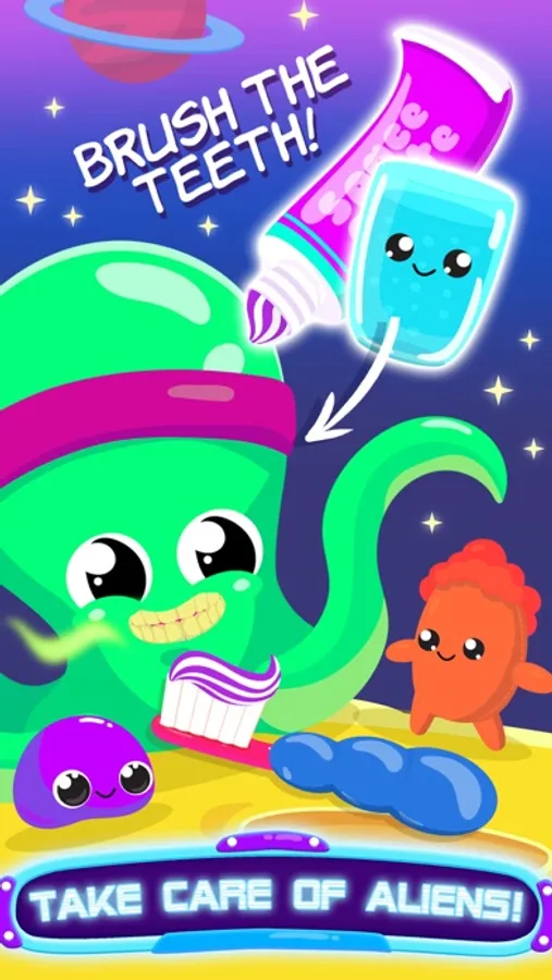 Fly to a pretty yellow planet with cute kitty Sue and teach the alien octopus teeth hygiene! Brush its teeth and make its smile shine again! Teeth care is super important for kids!
