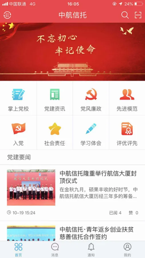 本应用是中航信托股份有限公司党建应用,包含丰富的党建信息、党建学习资源,并提供党建考核、会议管理、活动管理等多种党务工作处理功能,用户可在线进行各项工作。