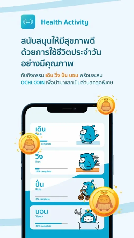 Ocean Club Application พัฒนากิจกรรมเพื่อสุขภาพ (Health Function) เพื่อช่วยให้สมาชิกสนุกกับการใส่ใจเรื่องสุขภาพของตัวเอง เพื่อนำไปสู่การมีสุขภาพที่ดีขึ้นกว่าเดิม ด้วยกิจกรรมทั้ง 4 ได้แก่ เดิน วิ่ง ปั่นจักรยาน และนอน โดยเชื่อมต่อข้อมูลกับฟรีแอปพลิเคชัน (เช่น Apple Health แอปพลิเคชัน) ให้สมาชิกสนุกกับการสะสม OCHI COIN (เหรียญโอชิ) ได้ทุกครั้งที่ออกกำลังกาย