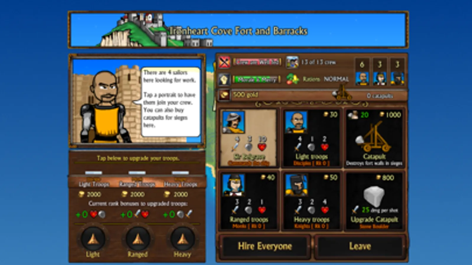 This is a pirate themed RPG / strategy unlike any other. One part Civilization, one part Ancient Art of War, one part Monkey Island, S&S Pirates sees you control one of ten famous sea captains, compete for islands, build ships, fight battles on land and sea, duel in arenas and on masts, search for treasure and try to avoid mutinous crews on your quest to gain control of Tritonia's massive oceans.
